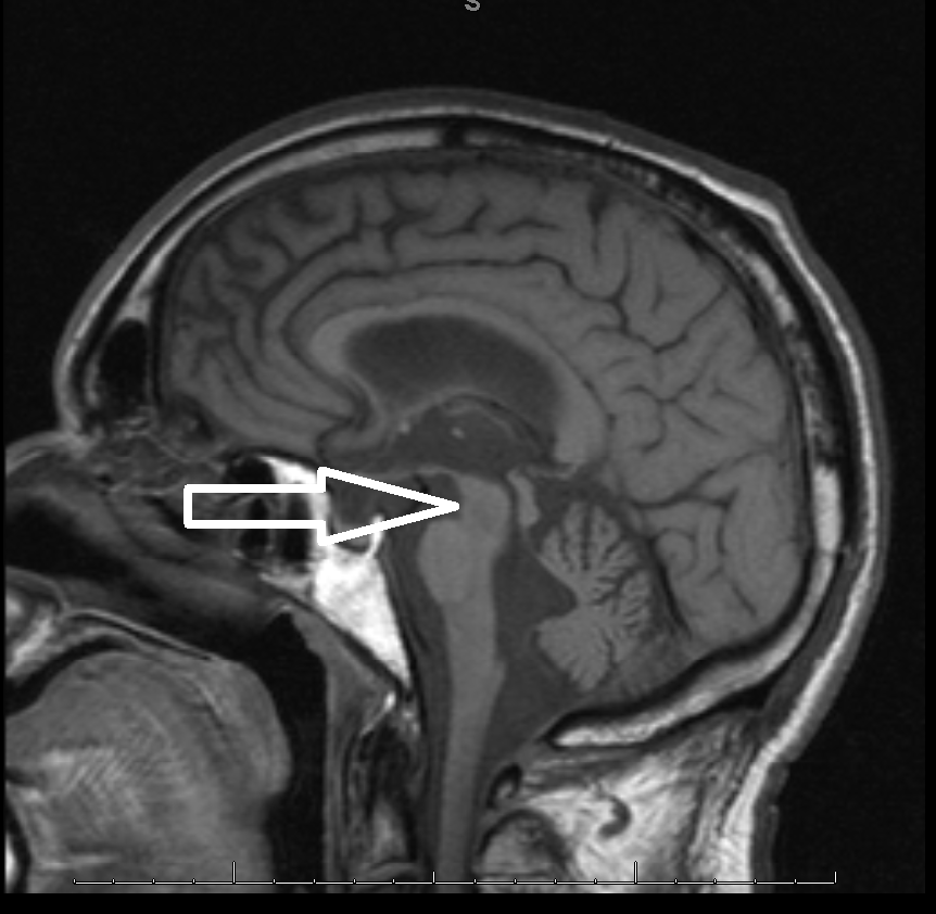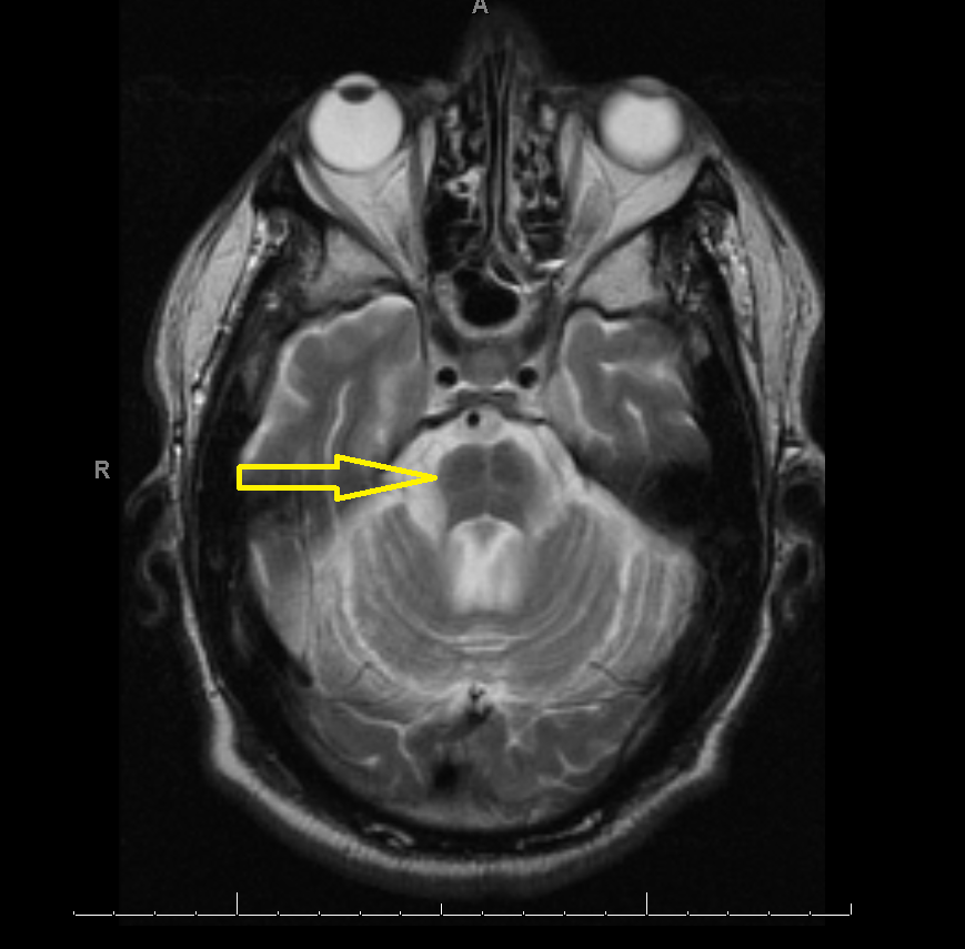 Middle age male patient admitted for evaluation of syncope. He has a history of coronary artery disease, severe pulmonary HTN, COPD, anemia of chronic disease, Osteoarthritis, left vocal cord paralysis, orthostatic hypotension, unsteady gaits and previous syncopal episode. CT head imaging remarkable for cerebellar atrophy. MRI done showed moderate cerebellar atrophy, midbrain atrophy with hummingbird sign and hot cross bun sign in the pons representing neurodegenerative disease multisystem atrophy and progressive supranuclear palsy.